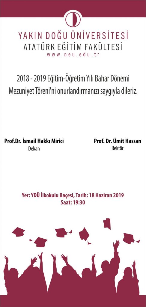 Atatürk Eğitim Fakültesi 2018-2019 Bahar Dönemi Mezuniyet Töreni, 18 Haziran saat 19:30’da Yakın Doğu İlkokulu bahçesinde gerçekleştirilecektir.