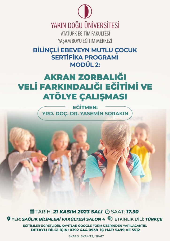 Atatürk Eğitim Fakültesi ile Yaşam Boyu Eğitim Merkezi Prof. Dr. Yağmur Çerkez ve Yrd. Dr. Dervişe Amca Toklu koordinatörlüğünde yüz yüze “BİLİNÇLİ EBEVEYN MUTLU ÇOCUK” Sertifika Programını 2. Modül 21 Kasım 2023 tarihinde yüz yüze saat 17:30’da Sağlık Bilimleri Fakültesi Salon 4’de gerçekleştirildi (SKA: 4, SKA: 17).
