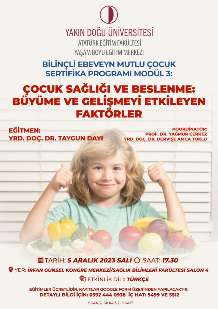 Atatürk Eğitim Fakültesi ile Yaşam Boyu Eğitim Merkezi Prof. Dr. Yağmur Çerkez ve Yrd. Dr. Dervişe Amca Toklu koordinatörlüğünde yüz yüze “BİLİNÇLİ EBEVEYN MUTLU ÇOCUK” Sertifika Programını 3. Modül 5 Aralık 2023 tarihinde yüz yüze saat 17:30’da Sağlık Bilimleri Fakültesi Salon 4’de gerçekleştirildi (SKA: 4, SKA: 17).