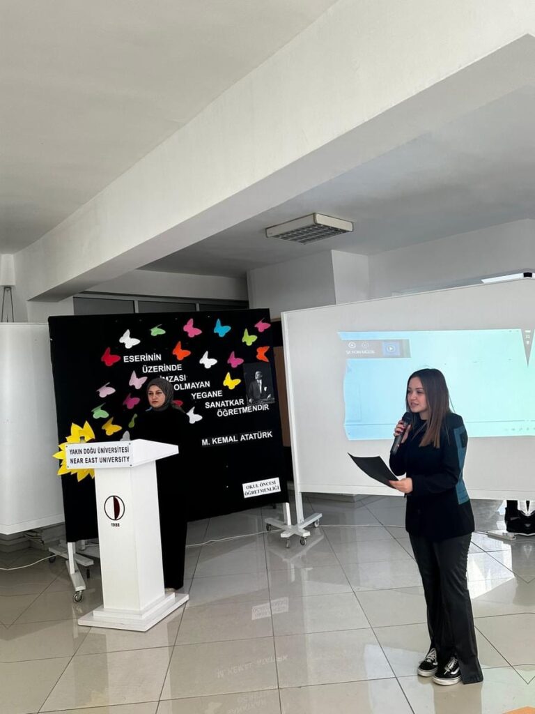 Yakın Doğu Üniversitesi Atatürk Eğitim Fakültesi, Temel Eğitim Bölümü Okul Öncesi Öğretmenliği Ana Bilim Dalı Öğretim Üyesi Yrd. Doç. Dr. Dervişe AMCA TOKLU’nun koordinatörlüğünde dördüncü sınıf öğretmen adayları “24 KASIM ÖĞRETMENLER GÜNÜ” etkinliği düzenledi. Öğretim Üyesi Uzm. Hulin SIDDIK koordinatörlüğünde dördüncü sınıf öğretmen adayları öğretmenlik uygulaması dersi kapsamında “24 KASIM ÖĞRETMENLER GÜNÜ” konulu pano hazırladılar. Etkinlikler öğretmen adaylarımızın donanımlı yetkinliklere sahip olması amaca ile planlanmıştır (SKA: 4, 17).