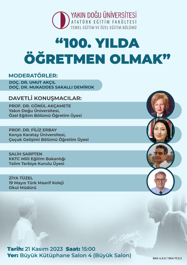 Doç. Dr. Umut AKÇIL ve Doç. Dr. Mukaddes SAKALLI DEMİROK moderatörlüğünde 21 Kasım 2023 Salı Saat 15:00 Yakın Doğu Üniversitesinde Kütüphane Salon 4’de gerçekleştirilecektir (SKA: 4.3.3./SKA: 17.2.2.).