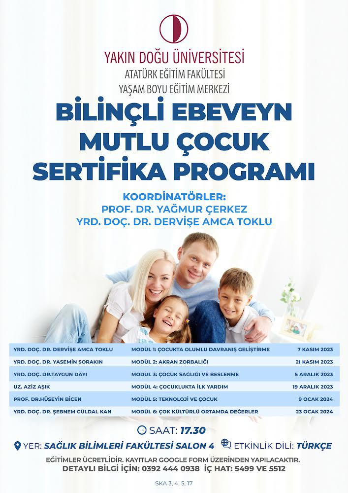 İlkokul ve okul öncesi yaş grubu çocukların ebeveynlerine yönelik hazırlanan ‘Bilinçli Ebeveyn, Mutlu Çocuk Sertifika Programı’ ebeveynler ile buluşmayı hedefliyor. Halka açık olan sertifika programı; “Çocukta Olumlu Davranış Geliştirme, Akran Zorbalığı, Çocuk Sağlığı ve Beslenme, Çocuklukta İlk Yardım, Teknoloji ve Çocuk, Çokkültürlü Ortamda Değerler” konularını içeren 6 modülden oluşuyor (SKA: 3, 4, 5, 17).
