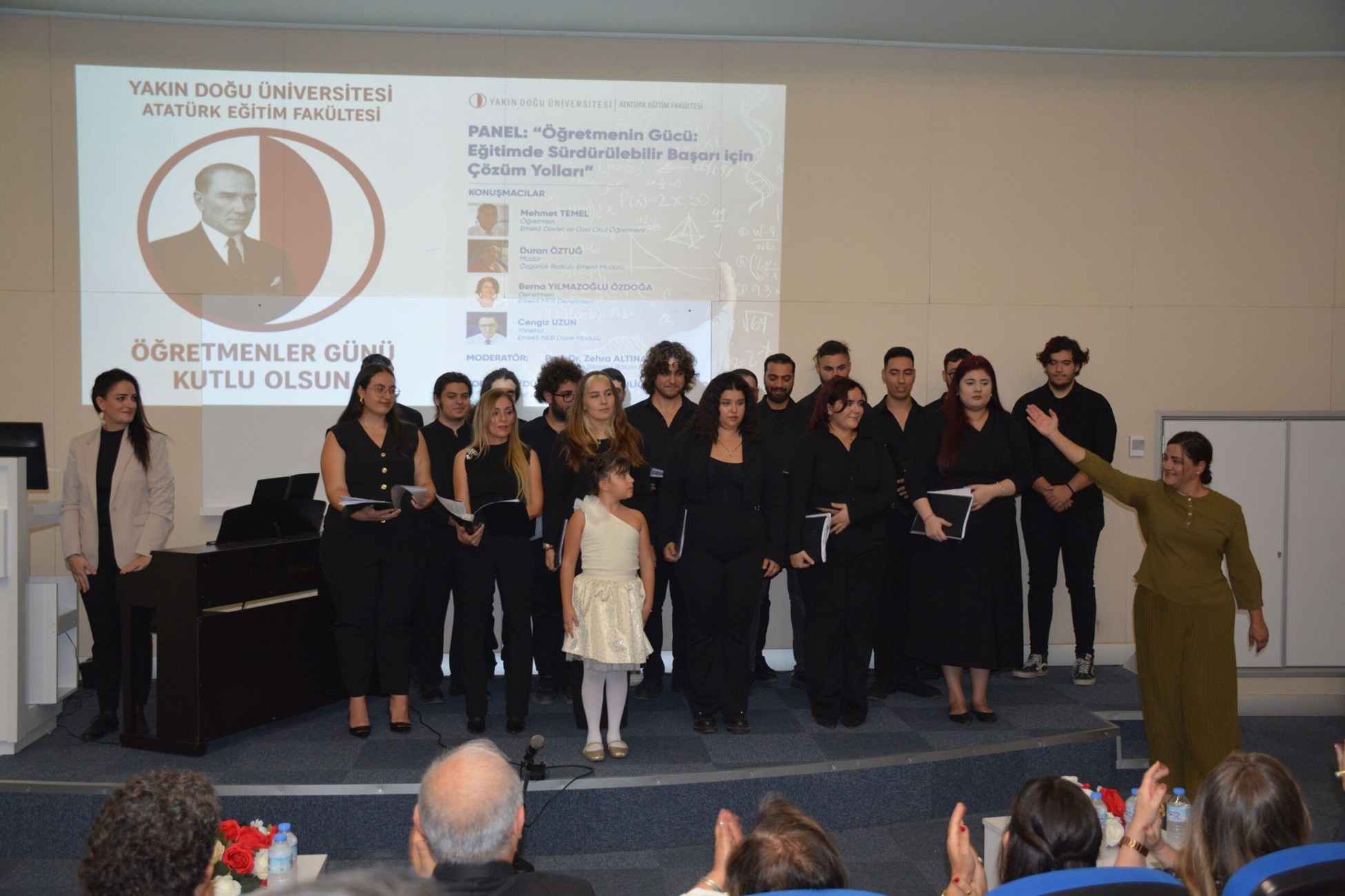 İstiklal Marşı ve saygı duruşu ile başlayan “Öğretmenin Gücü: Eğitimde Sürdürülebilir Başarı için Çözüm Yolları” paneli, Yakın Doğu Üniversitesi Rektör Yardımcısı Prof. Dr. Mustafa Kurt ve Girne Üniversitesi Rektör Yardımcısı Prof. Dr. Gökmen Dağlı, birçok fakültenin dekanı, akademisyenler ve öğrencilerin yoğun katılımıyla gerçekleştirildi. Yakın Doğu Üniversitesi Müzik Öğretmenliği Ana Bilim Dalı Korosu’nun, Şef Doç. Dr. Emine Kıvanç Öztuğ yönetimindeki dinletisiyle başlayan etkinliğin Moderatörlüğünü Atatürk Eğitim Fakültesi Eğitim Bilimleri Bölüm Başkanı Prof. Dr. Zehra Altınay Gazi üstlendi. Panelde, Milli Eğitim Bakanlığı Emekli Daire Müdürü Cengiz Uzun, Emekli Denetmeni Berna Yılmazoğlu Özdoğa, Özgürlük İlkokulu Emekli Müdürü Duran Öztuğ ve Emekli Devlet ve Özel Okul Öğretmeni Mehmet Temel konuşmacı olarak yer aldı. Panelin açılış konuşmasını ise Atatürk Eğitim Fakültesi Dekanı Prof. D. Umut Akçıl gerçekleştirdi.