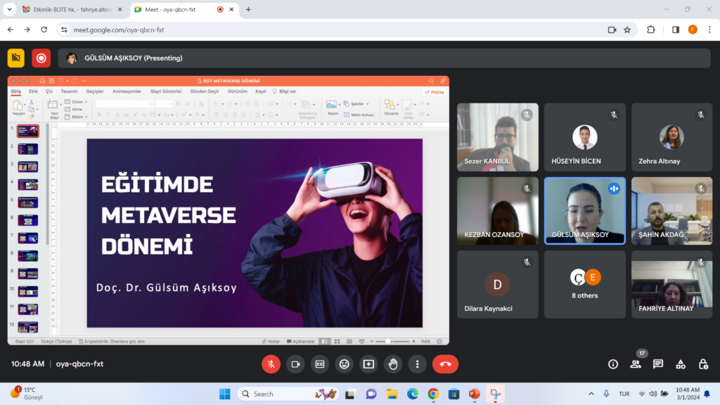 Doç. Dr. Gulsum Aşıksoy, eğitimde metaverse uygulamalarını anlattı. Eğitimde metaverse geleceğinden bahsederek, ileriye dönük raporlarda geçen ana noktaları vurguladı. Avatar kullanımından da bahsederek, üç boyutlu ortamların, deneyimleme ortamların da önemini belirtti. Öğretim ortamının nasıl tasarlandığı konusunda bilgi verdi.