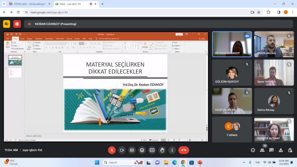 Yard.Doç. Dr Kezban Ozansoy, materyal seçiminde dikkat edilmesi gereken kriterleri öğrenciye uygun standartları açıklayarak, materyalin öğrenme ve öğretmeye katkısını belirtti.