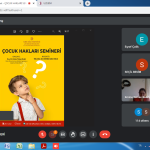 Temel Eğitim Bölümü Okul Öncesi Öğretmenliği Ana Bilim Dalı 25 Kasım 2022 cuma günü çevrimiçi olarak konuşmacı Doç. Dr. Emine Yılmaz Bolat’ın katılım gösterdiği “20 Kasım Çocuk Hakları” seminerini Yrd. Doç. Dr. Dervişe Amca Toklu koordinatörlüğünde gerçekleştirdi.